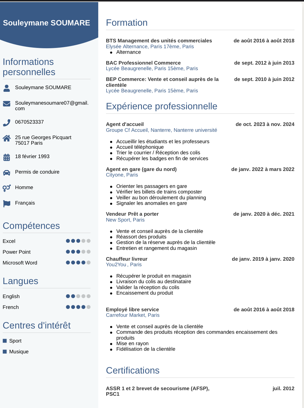 | Jean-Marie SEMOPA | En recherche d’emploi | Agents de maîtrise | Fonction marketing et Vente | Télécharger | |