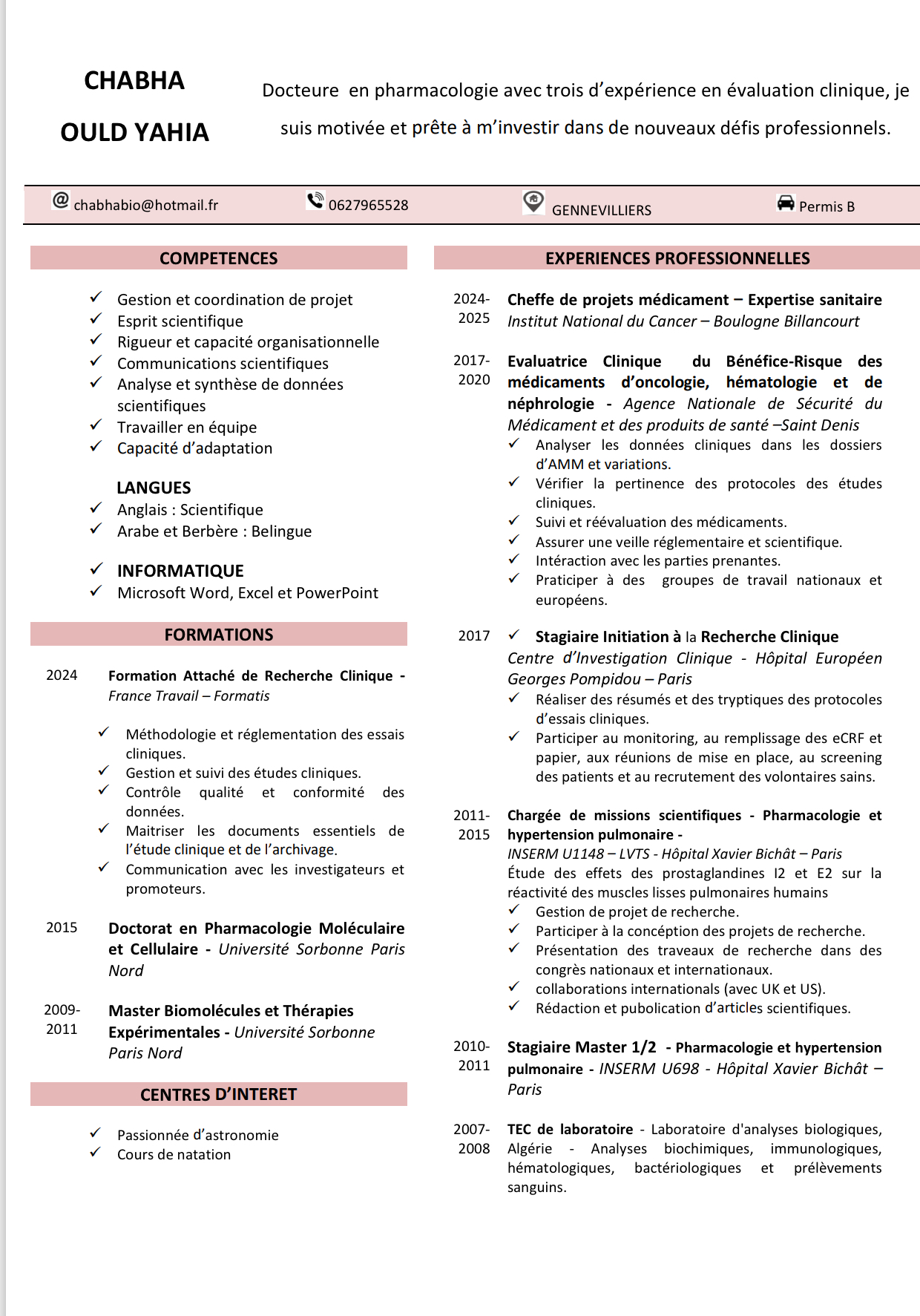 | Chabha Ould yahia | En recherche d’emploi | Cadres | Fonction recherche et développement | Télécharger | |